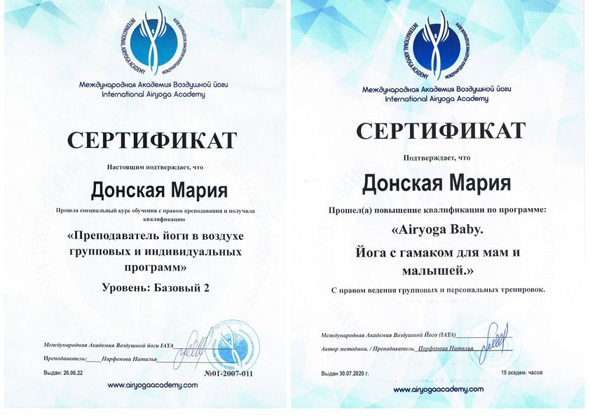 2) преподаватель "Йоги в воздухе" (Международная Академия Воздушной Йоги IYAY);