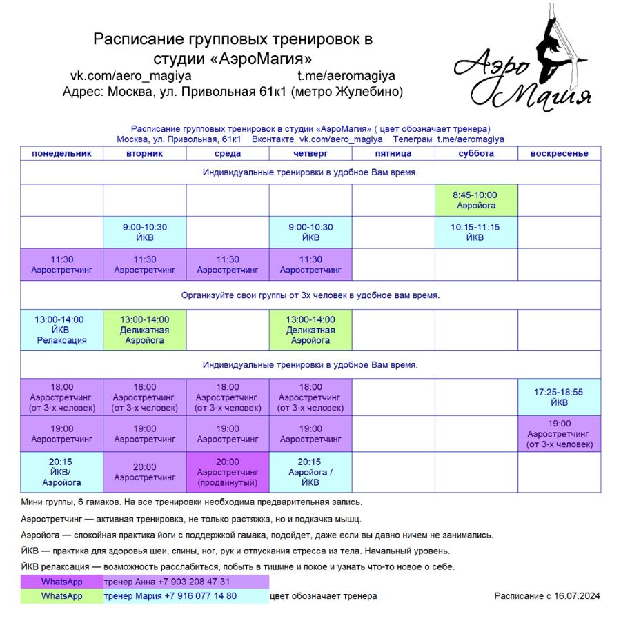 Расписание групповых тренировок в студии АэроМагия: аэростретчинг, аэройога, ЙКВ в Жулебино